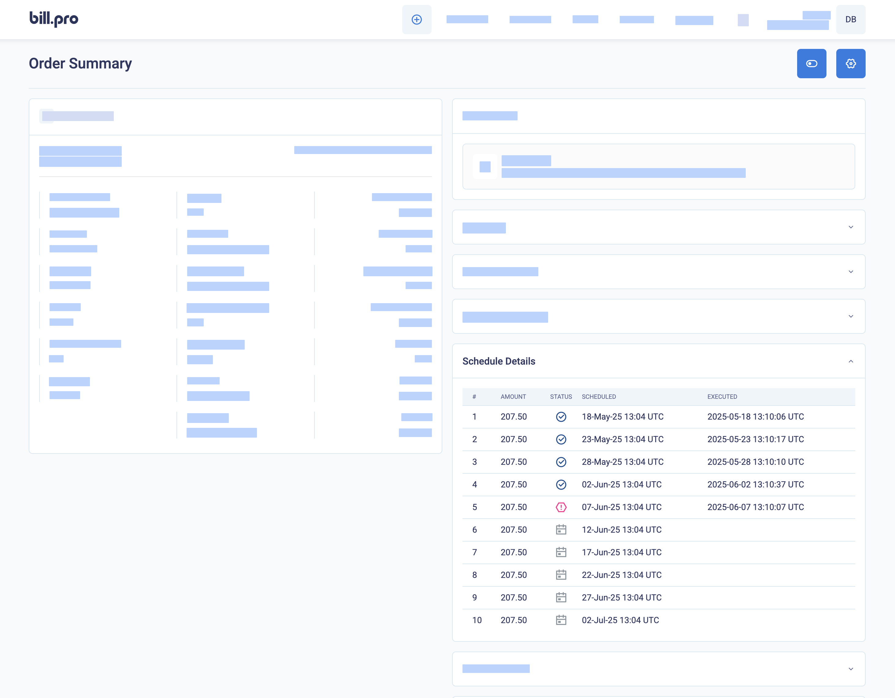 In the Order Summary, the Schedule Details does not include all transactions. To display refunds, card authorisations, and initial payments, see Related Transactions. To display all transactions, go to the Payments section and select All Processed. See Display all processed transactions.