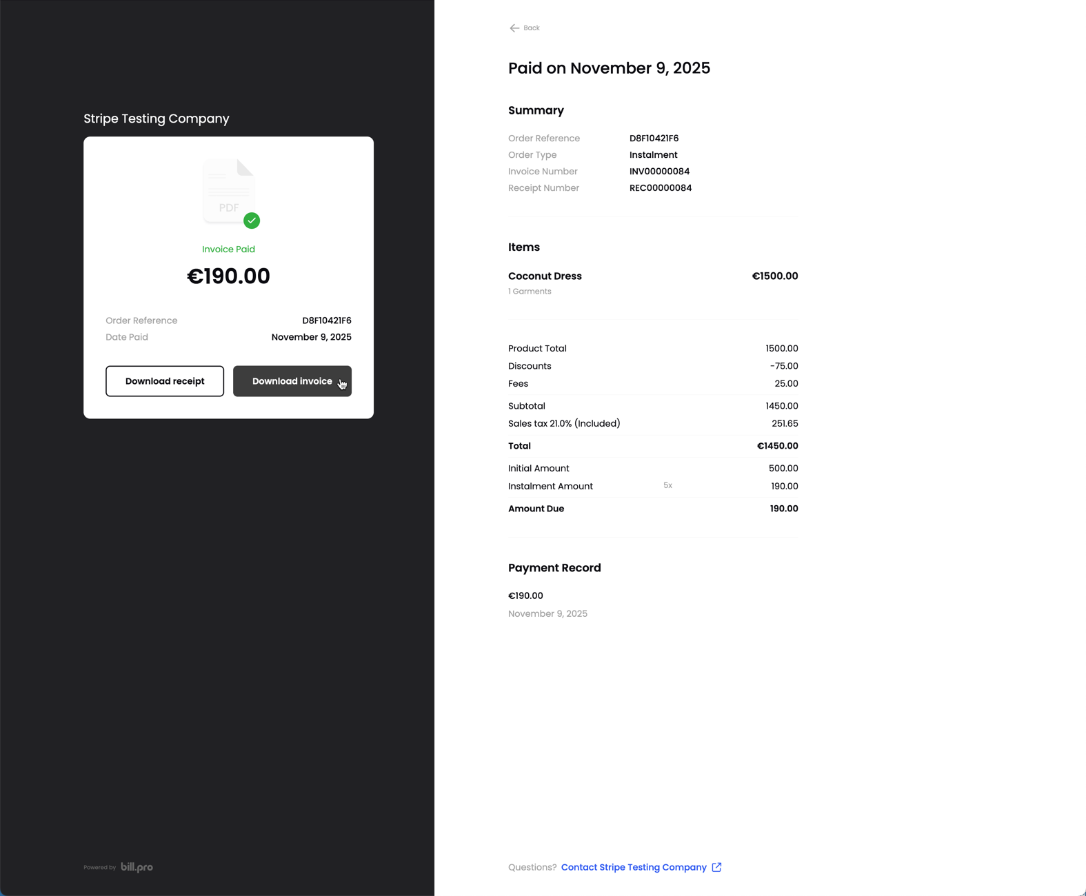 If PDF invoicing is active for the merchant, the customer can download the invoice and receipt from the invoice details view. This is in addition to the invoice download button in the Billing History.