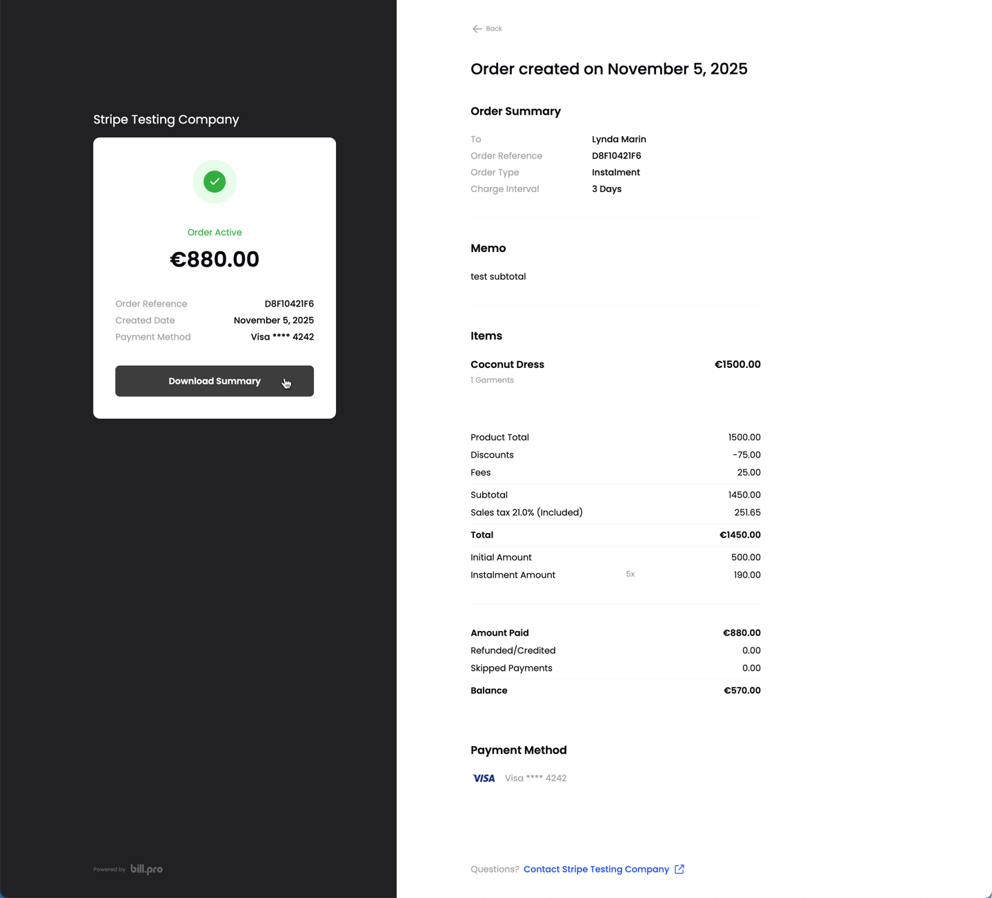 The order details view contains all the details of the order and from this view, the customer can download the order summary.