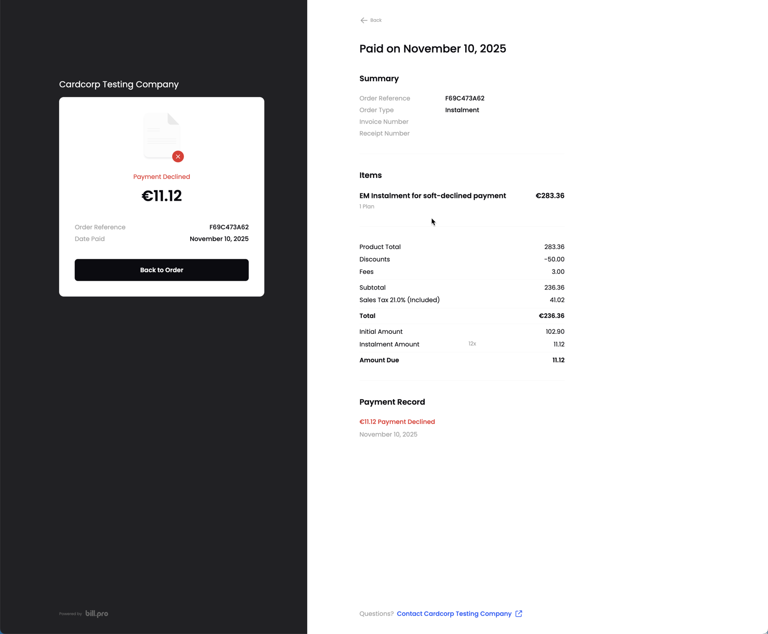 For a declined payment, the customer can display the details of the payment, but cannot download an invoice or a receipt.
