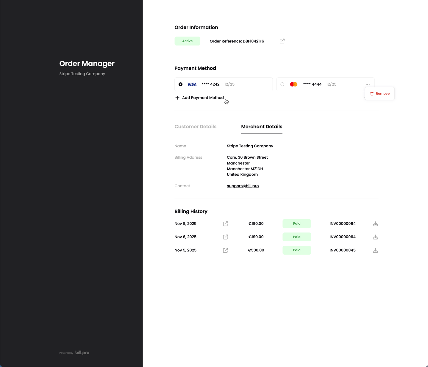 After the customer confirms, BillPro opens a secure checkout and the customer can enter their card details. When the customer clicks + Add Payment Method, BillPro also opens a secure checkout and the customer can enter their card details.