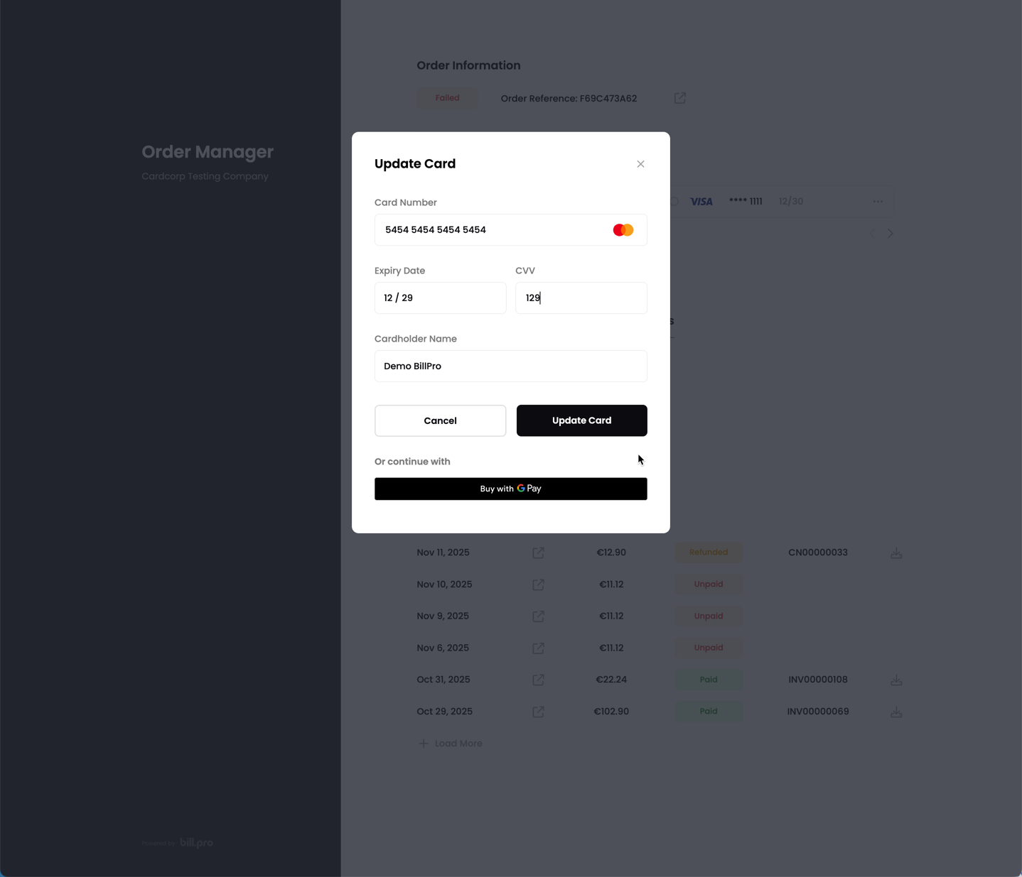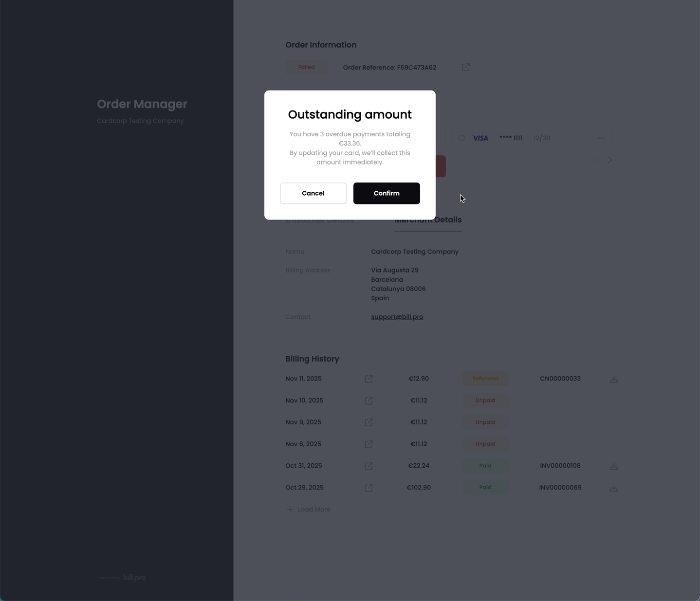 When the customer clicks Update Card, BillPro displays the outstanding amount for the customer to confirm.