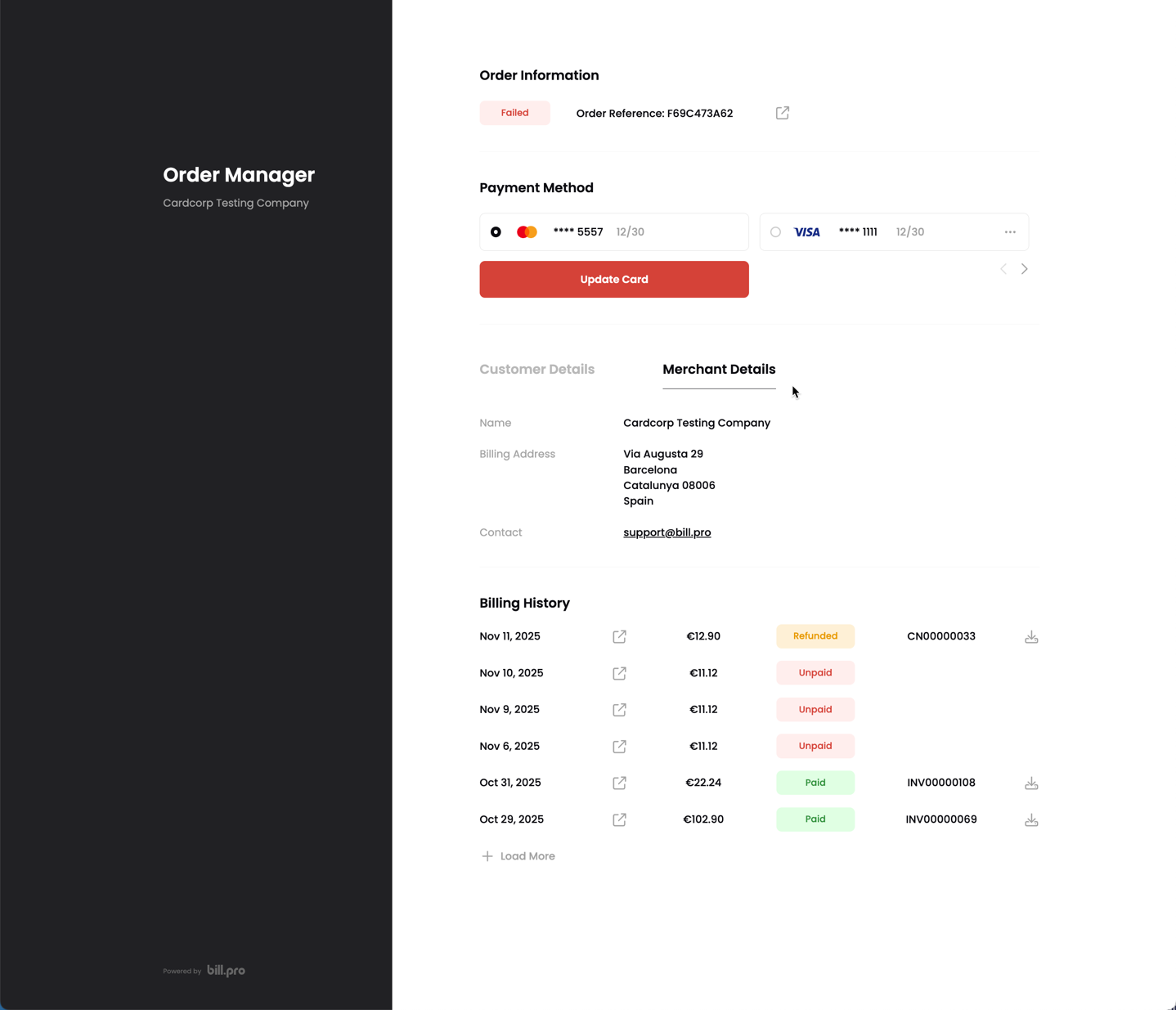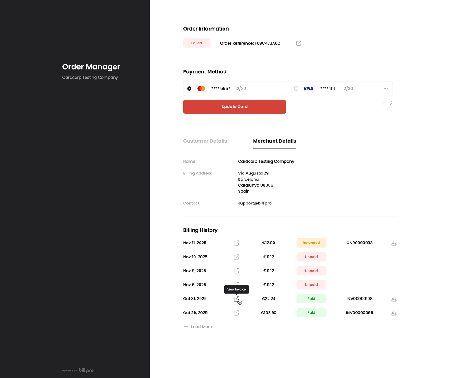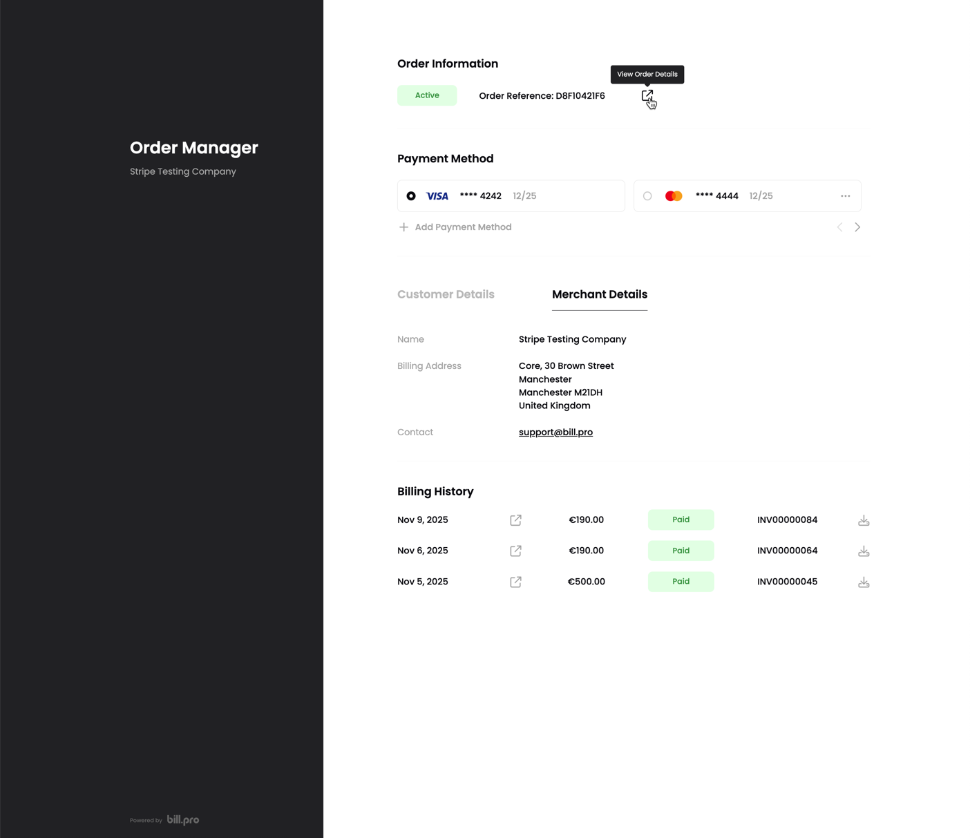 From the Billing History, the customer can view all payments, view the details of approved payments and refunds, and download invoices and credit notes.