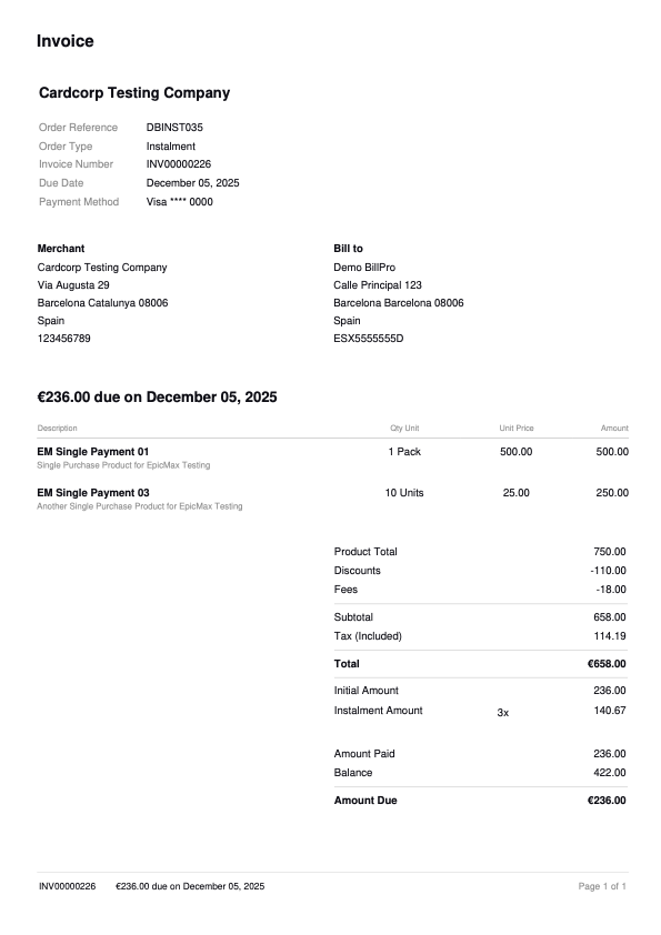Customers can always download the order summary in PDF format. If PDF invoicing is activated, the customers can download invoices, receipts, and credit notes in PDF format.