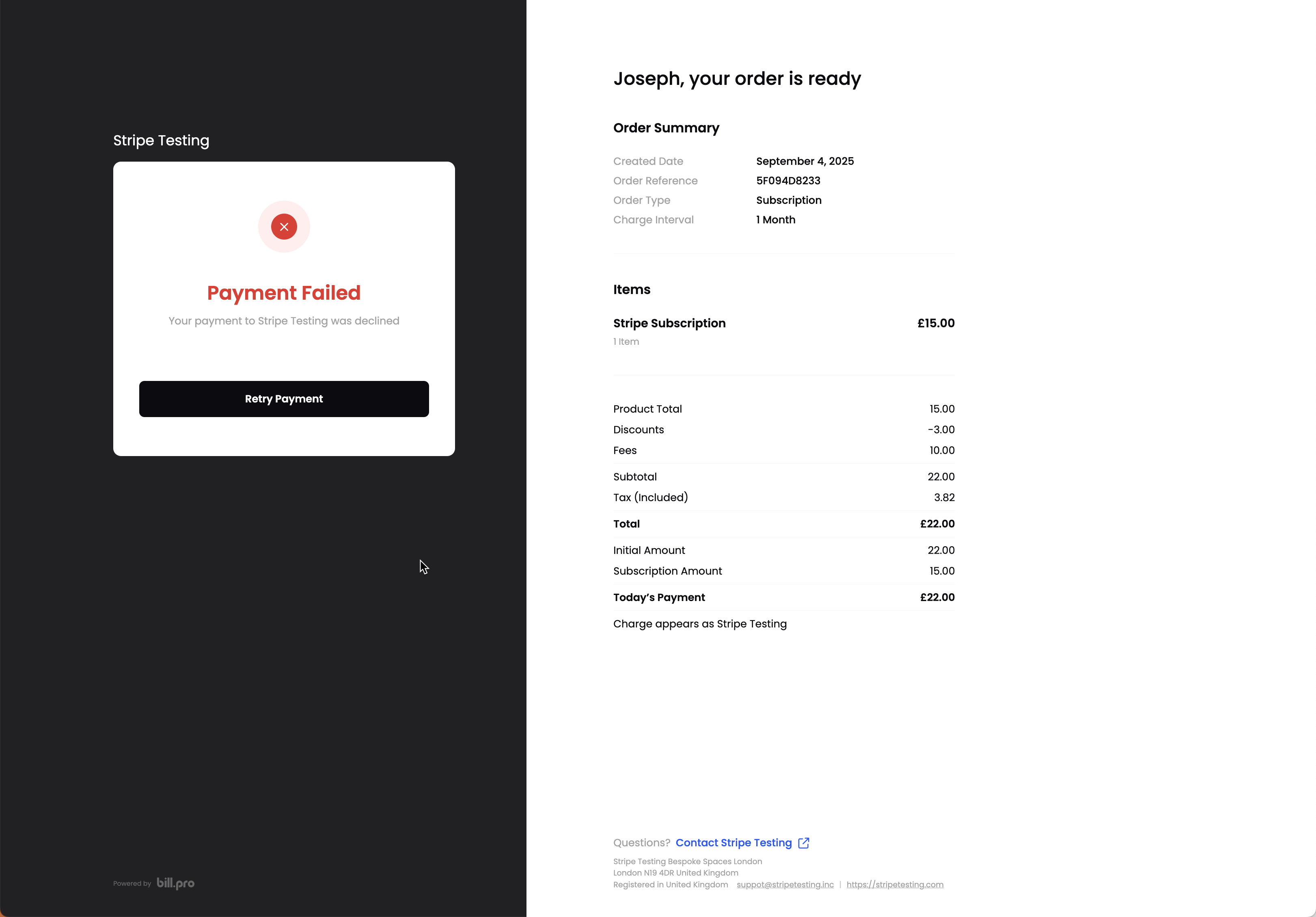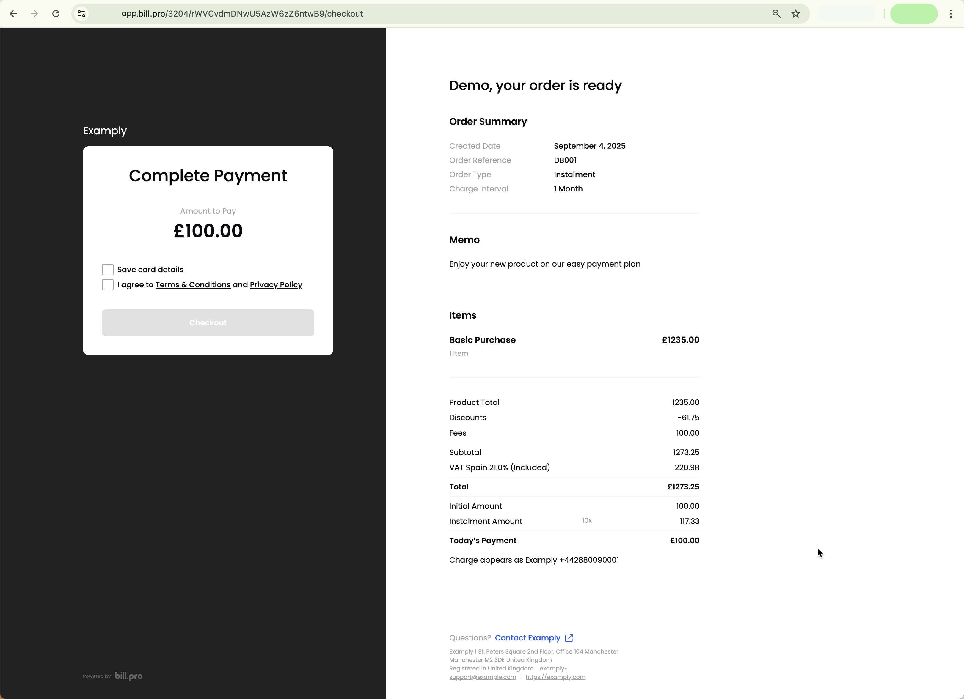 When the customer clicks on Proceed to Checkout in a payment request message or uses a payment link directly, BillPro opens a secure checkout page.
