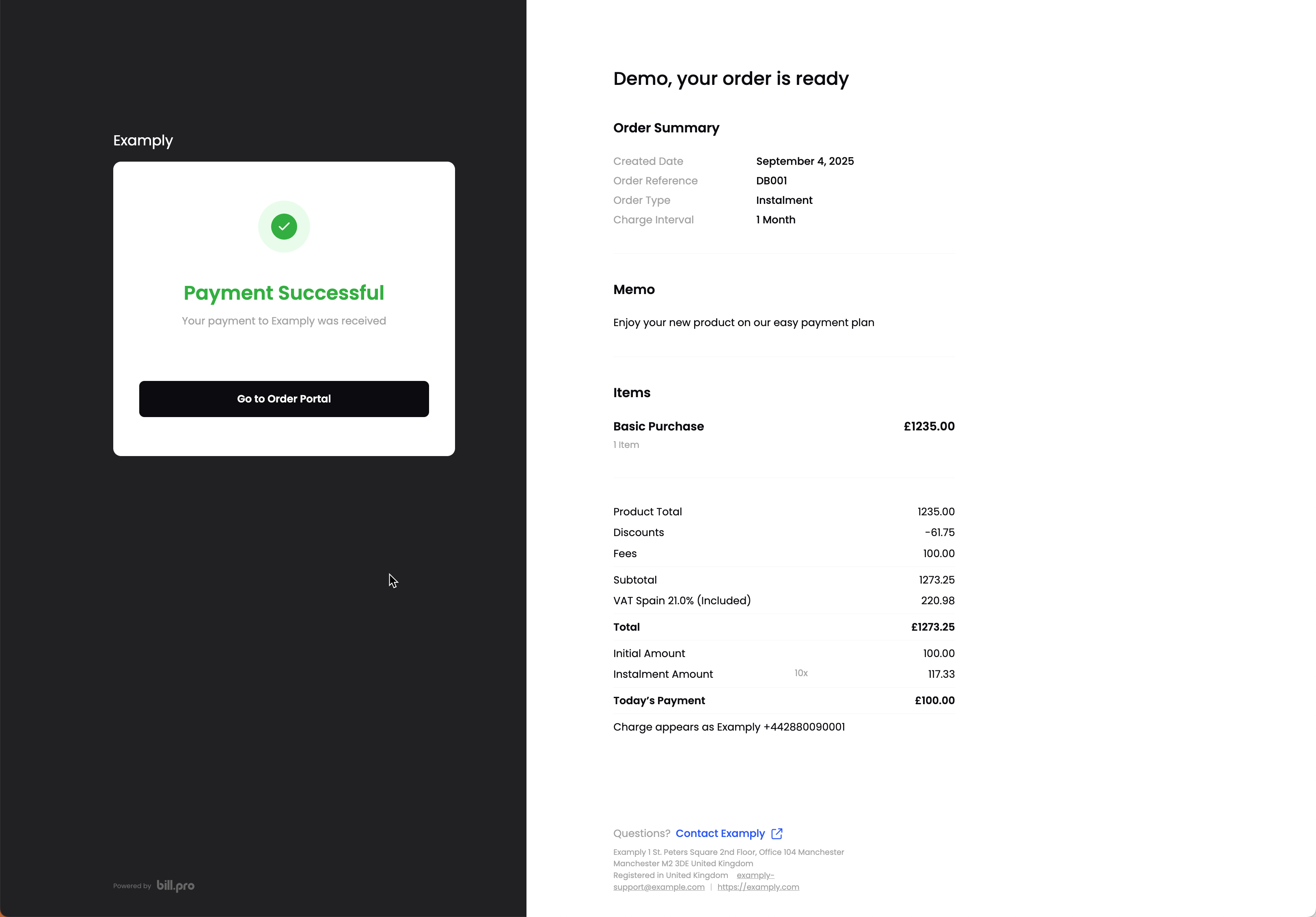 The customer can click on the Go to Order Portal button to view the full details of their order, and manage cards for recurring payments. If PDF invoicing is active, the customer can download invoices, receipts, and credit notes. All payment links will now also open the customer's order in the order portal.